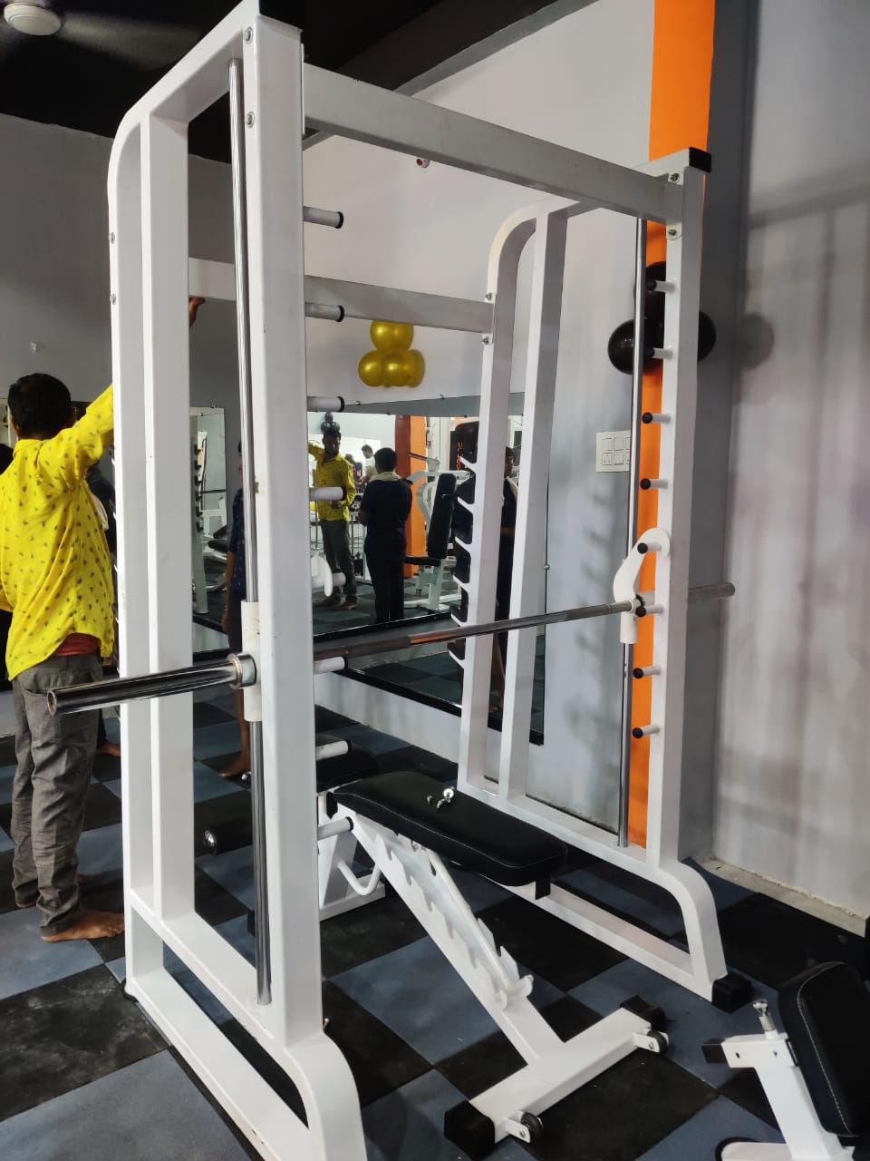 Smith + Squat This Machine is a versatile gym apparatus featuring a barbell fixed within vertical rails, allowing only a strict up-and-down motion for enhanced stability, making it ideal for squats, presses, and more; its key components are the guided barbell, adjustable safety catches, foot platform, and commercial-grade build, providing a safe, controlled environment for building leg strength with less need for stabilization than free weights. contact s s fitnss nagpur manufacturer of gym machine 8055144559 8484902503